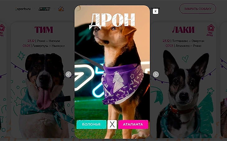 Осенью прошлого года PARI обратилась к нам с идеей сделать спецпроект, в котором собаки из приюта предсказывают результаты футбольных матчей, а пользователи поддерживают хвостатых – вносят депозиты с промокодом «Добро», процент от которых идет на корм, или оставляют заявки, чтобы познакомиться с понравившемся песелем и забрать его домой. У нас раньше было не так много проектов, связанных с благотворительностью или видеоконтентом, поэтому студия сразу же вдохновилась идеей клиента. Она показалась отличной возможностью сделать доброе дело, попробовать новое и прокачать свои навыки. Все началось с поиска собак, которые должны были выступить в роли прогнозистов. За этим мы обратились в фонд помощи бездомным животным «РЭЙ». Пока шел подбор четвероногих, мы разработали концепцию эксплейнера – видеоролика, объясняющего суть проекта, и написали сценарий. Когда собаки были найдены, команда приступила к съемкам. Помогали нам опытные коллеги из United – собственного продакшна Sports.