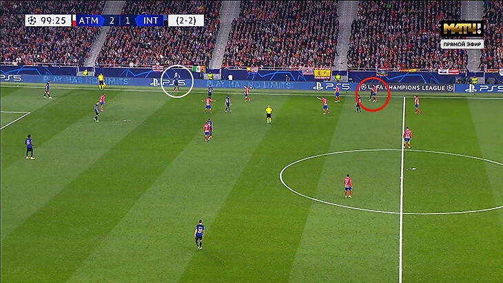 И это в центре поля, во время паузы – пока игроки максимум боролись за позицию метрах в 20 от мяча в руках у игрока «Интера» за бровкой, перед вводом аута.