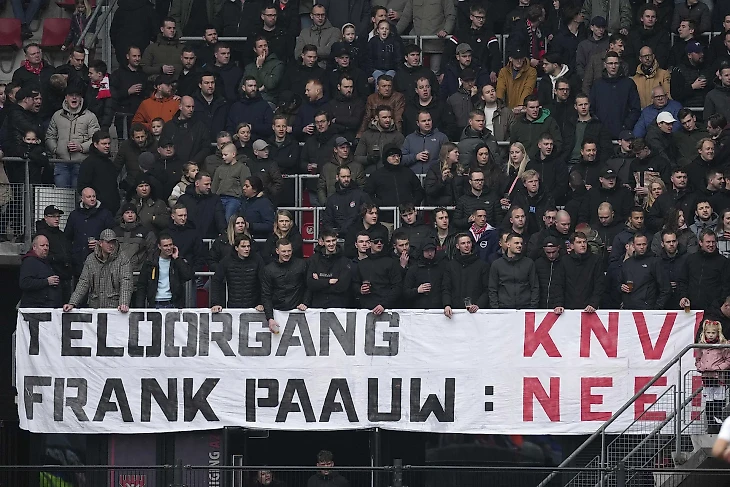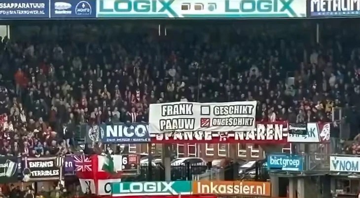 Фаны роттердамской «Спарты» на домашней игре против «Аякса», которые и представляют город, где в последние годы работал Франк Пау, на своем баннере голосуют против его предстоящего назначения.