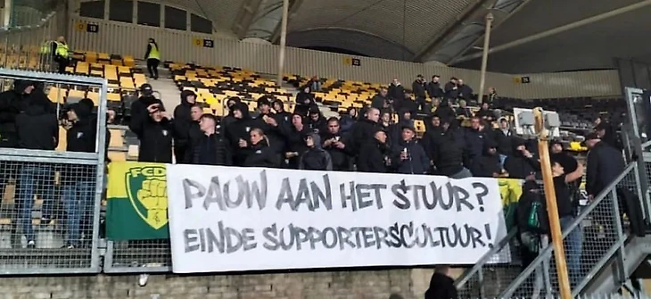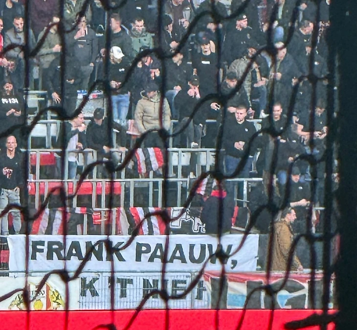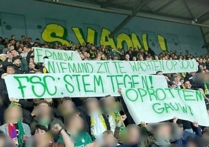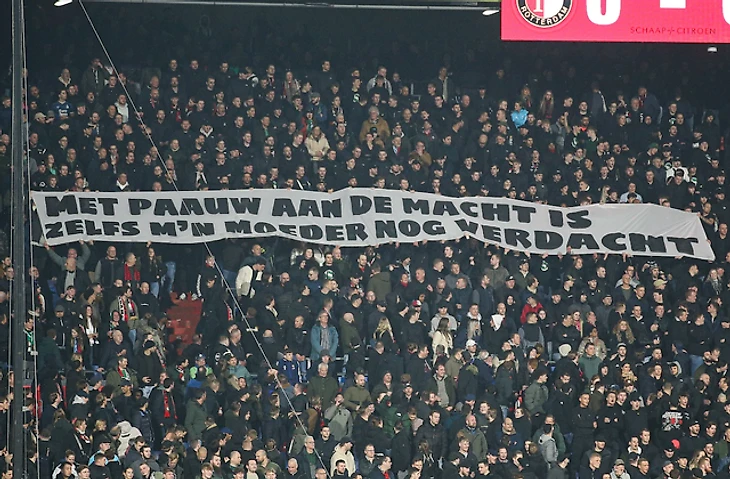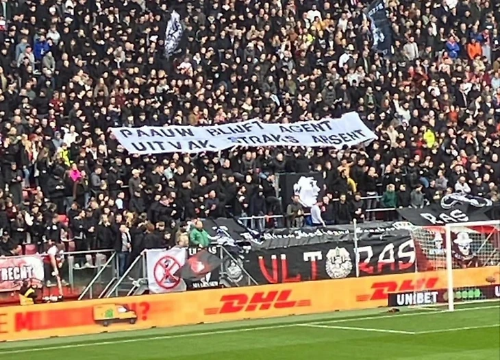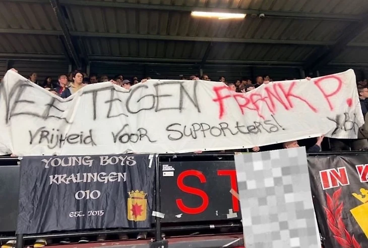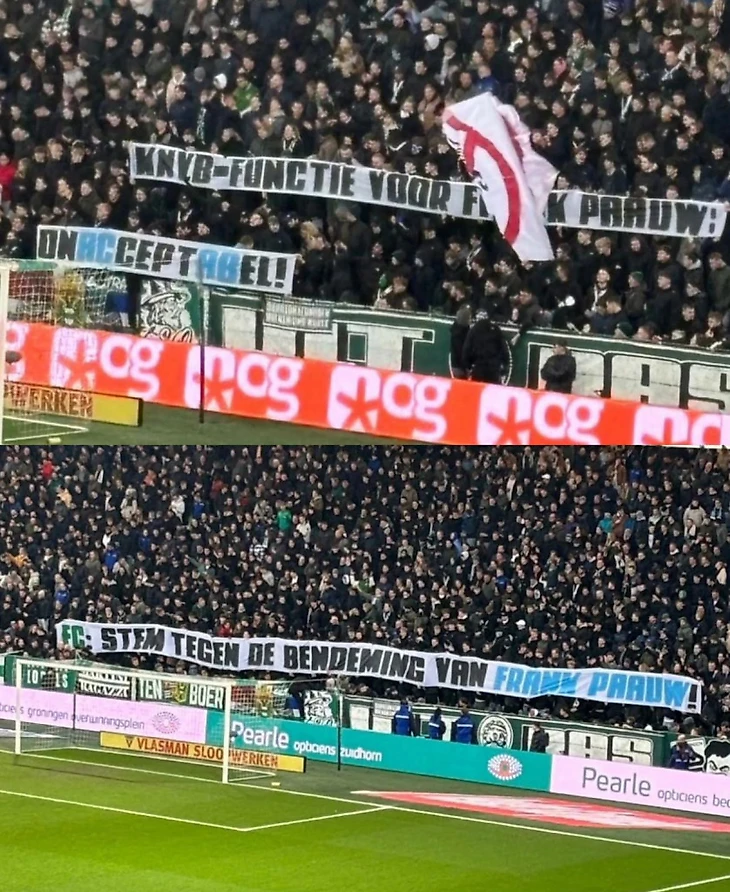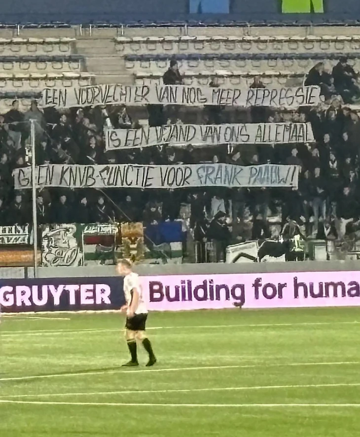 «Гронинген» на выезде с баннером «Главный герой, который выступает за усиление репрессий, является врагом всех нас! Никакой должности в Королевском футбольном союзе для Франка Пау!».