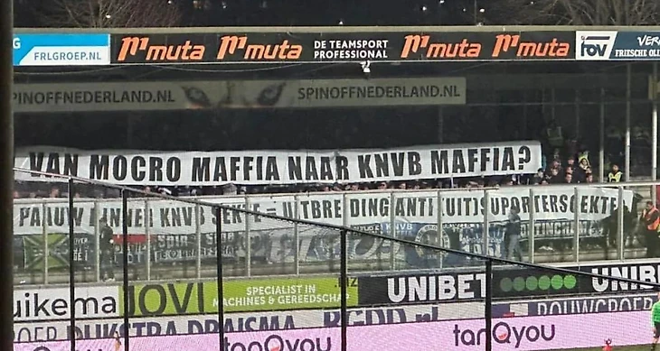 Фанаты «Де Графсхапа» на в выездной игре с послание «От мафии Мокро до мафии в Королевском футбольном союзе Нидерландов? Пау внутри секты Королевского футбольного союза = увеличение безумных мер против выездных болельщиков». Мафия Мокро — это название, данное голландской полицией марокканской банде, действующей в Нидерландах и Бельгии, которая специализируется на торговле наркотиками.