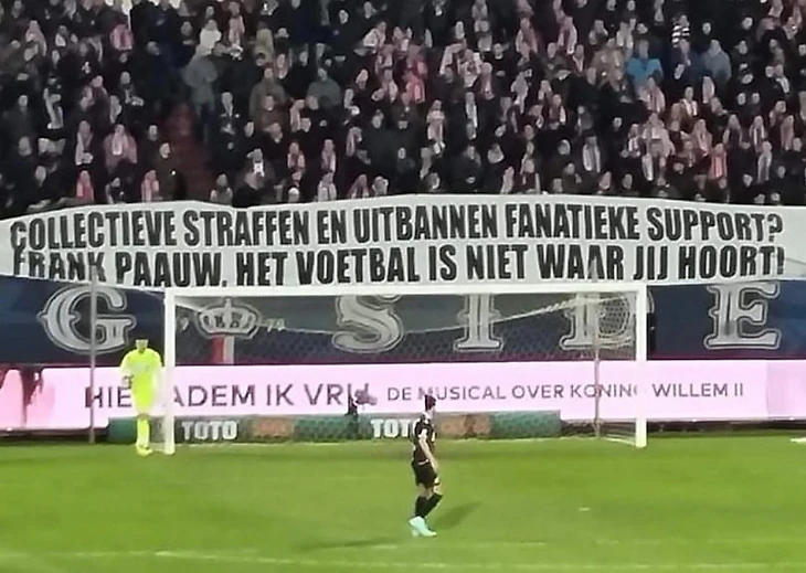 «Коллективное наказание и запрет фанатской поддержки? Франк Пау, тебе не место в футболе!» – баннер ультрас «Виллема» на домашней игре с «Эйндховеном» во 2-м дивизионе Нидерландов.