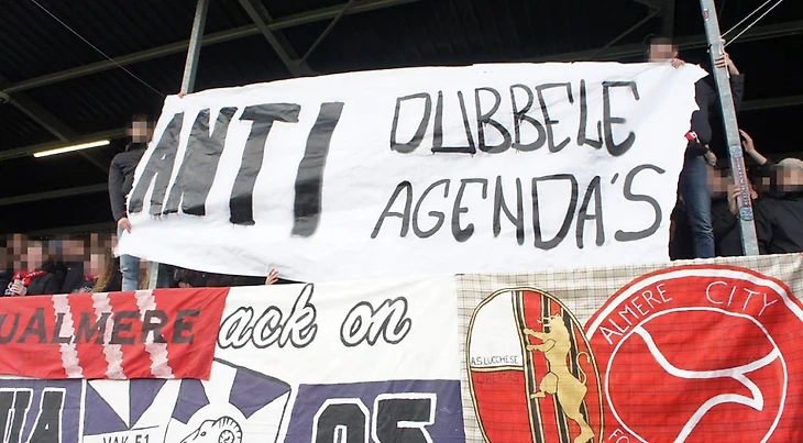 Баннер «Против двойных агентов!» на матче «Алмере Сити»–«Фейенорд», намекающий на то, что полицейский не может занимать руководящую должность в футбольной организации.