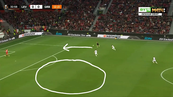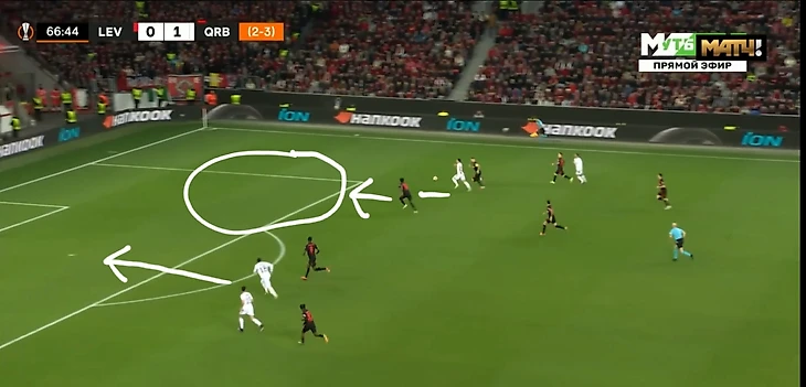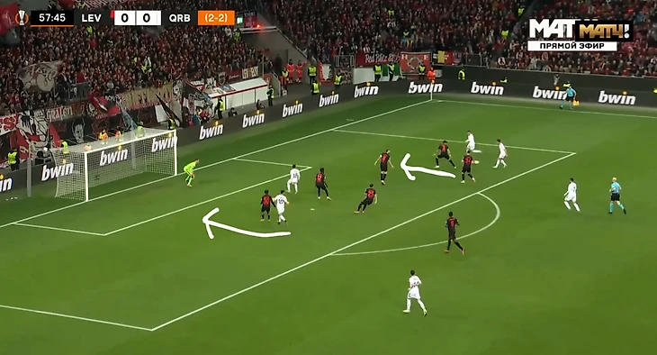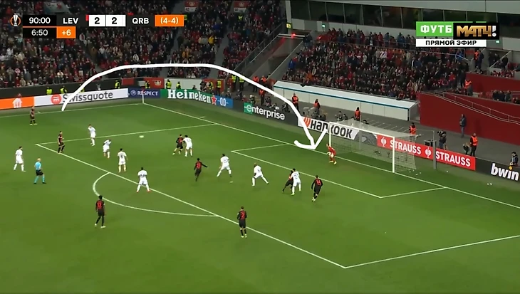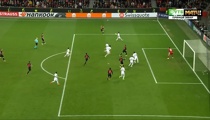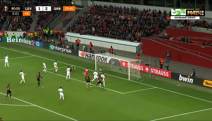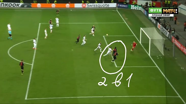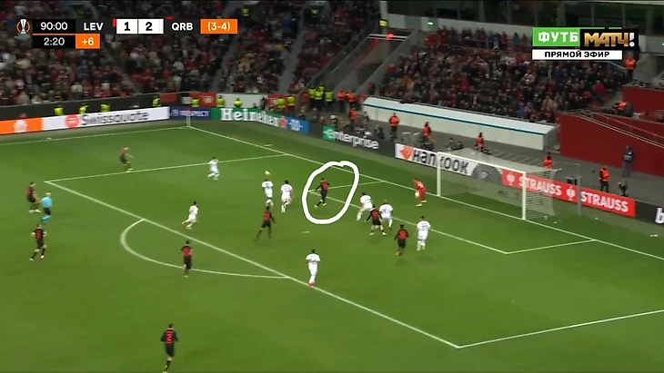 В конце второго тайма леверкузенцы убежили в контратаку. Коварж забросил мяч на Вирца, который протащил его до штрафной соперника и отдал передачу на Фримпонга. Но удар снова прошёл мимо ворот.