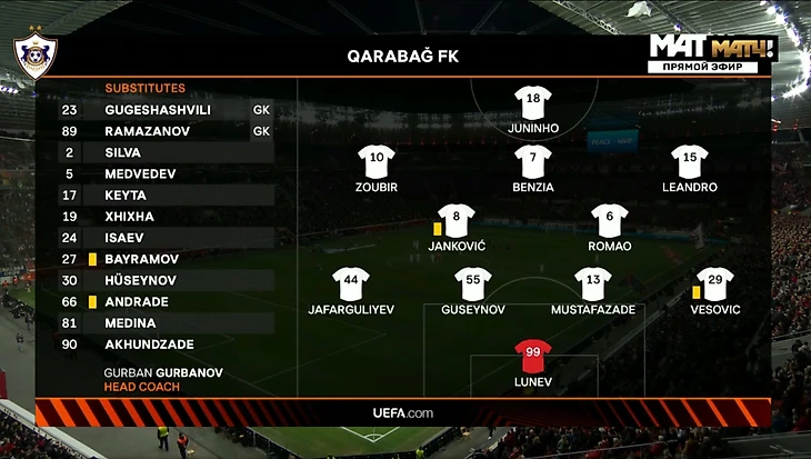 Дальше было ещё удивительнее: сначала игрок «Карабаха» Эльвин Джафаргулиев получил красную карточку после вмешательства VAR из-за фола на Фримпонге, а через три минуты Жуниньо увеличил счет до 2:0.