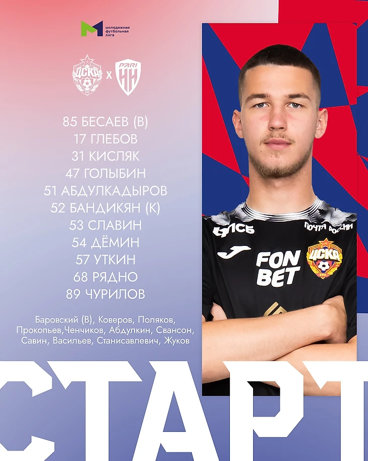 15 марта 2024, 11:47 1 мин. Стартовый состав молодежной команды на игру с «Пари НН»!ААГАвтор524 подписатьсяПрямая трансляция Триколора доступна по ссылке: https://kino.tricolor.tv/channels/watch/futbolnyy/ ЦСКА мол