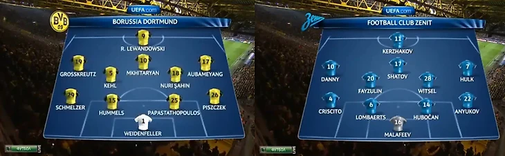 Исход был решен к пятой минуте игры на «Петровском»: Генрих Мхитарян и Марко Ройс отправили по мячу в ворота Юрия Лодыгина. Во втором тайме Олег Шатов и Халк попытались вернуть интригу, но Роберт Левандовски ответными ударами снова закрыл все вопросы – 2:4.