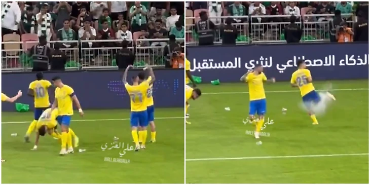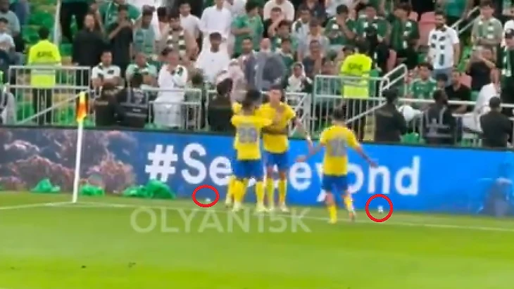 В первом тайме Роналду забил с острого угла и отпраздновал гол перед трибунами «Аль-Ахли». Тут же рядом с Кришем приземлились два стакана.