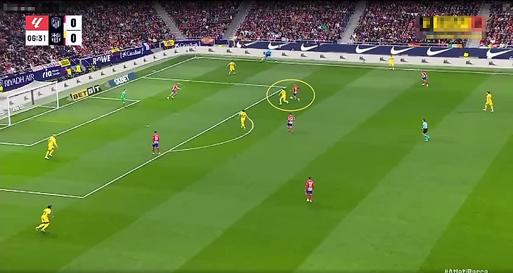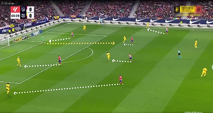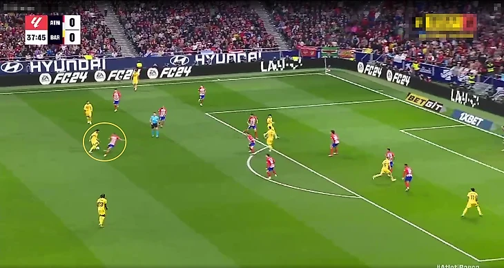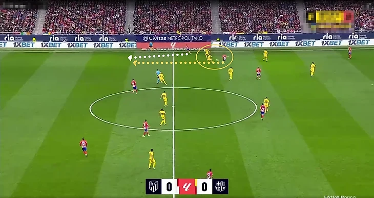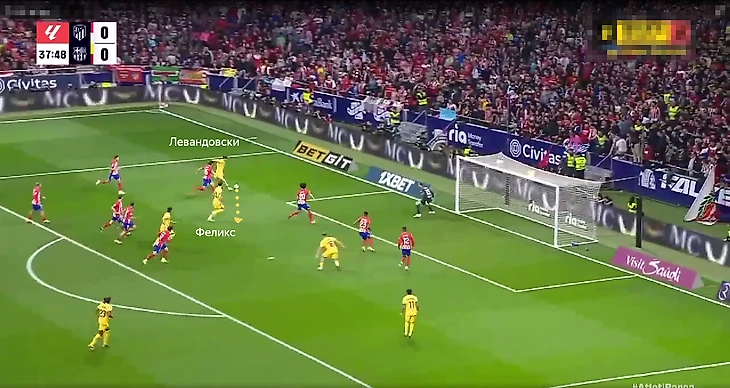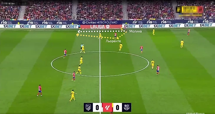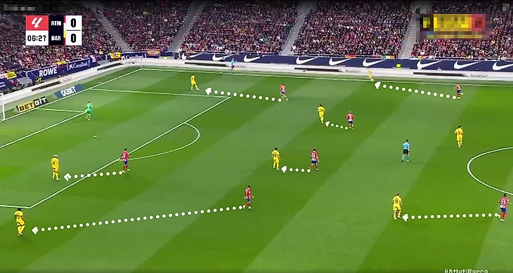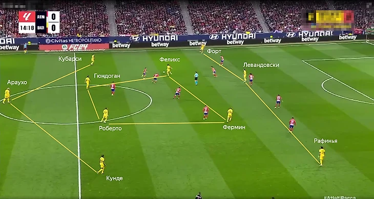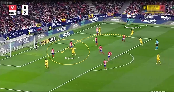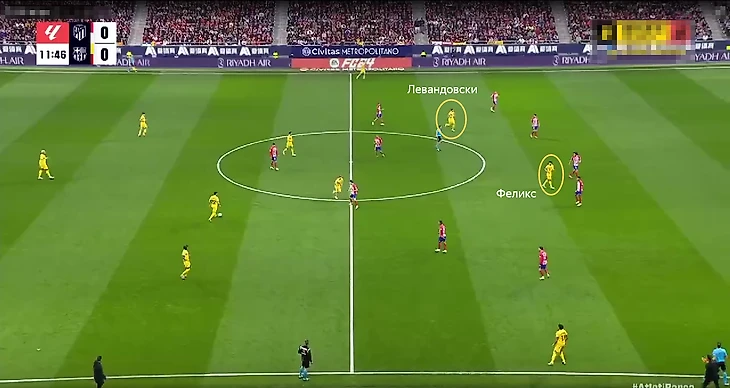 Но это по цепочке приводило к свободе между линиями. Феликс, Левандовски и Фермин постоянно опускались глубину и получали мяч в свободных зонах. Задача футболистов оборонительной линии «Атлетико» в такой ситуации заключалась в том, чтобы своевременно выдёргиваться за своими оппонентами и не позволять им свободно принимать мяч. Но и это не всегда удавалось.