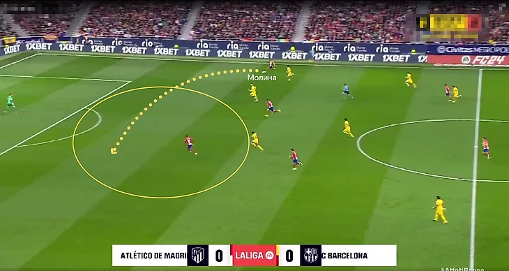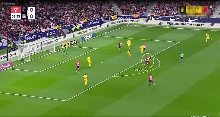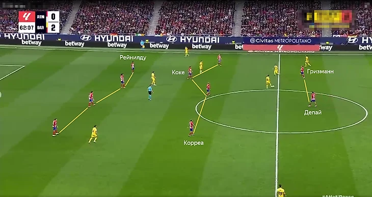 «Атлетико» не всегда действовал достаточно компактно. Периодически случался рассинхрон в действиях верхней и нижней пятёрок – одна линия могла подниматься в давление, а другая оставалась слишком низко. Возможно, опасались передач за спину защитникам («Барса» в последнее время прибавила в данном компоненте).
