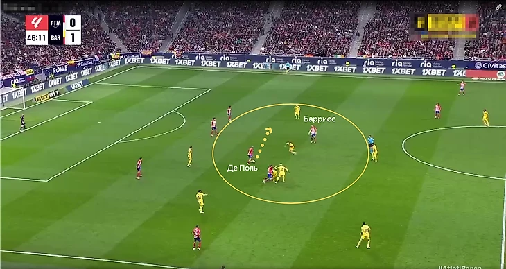 Прессинг «Барселоны» (PPDA = 7.1) тоже привычно приносил пользу. Например, второй гол пришёл после потери Де Поля под давлением, когда ближние варианты разобрали. Аргентинец мог сыграть назад, но в любом случае прессинг команды Хави оказал важное влияние на эпизод.