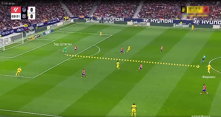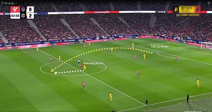 Такой рисунок побудил команду Хави искать альтернативны способы преодоления чужого давления. Подходящий вариант быстро нашли – Тер Штеген часто получал свободу на мяче. Игроки «Атлетико» разбирали футболистов «Барсы», но Марк оставался свободным.