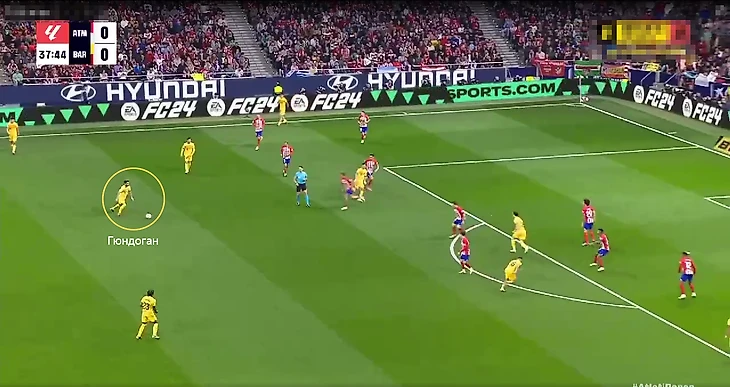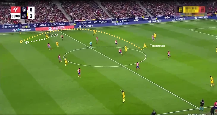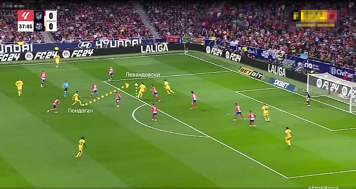На первых минутах команда Симеоне попыталась задавить «Барселону» высоким прессингом, что не только мешало продвижению соперника, но и приводило к опасности у чужи ворот. Например, здесь у Тер Штегена разобраны все ближние варианты. Марк отдаёт Гюндогану – случается потеря, которая приводит к опасном удару Барриоса.