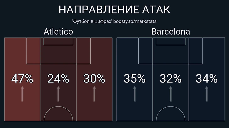 Теоретически команда Симеоне могла лучше использовать фланги. «Барселона» действует с четвёркой защитников (не опускает кого-то пятым на постоянной основе), из-за чего больше свободы остаётся на краях. Перед матчем казалось, что «Атлетико» будет целенаправленно бить в эти зоны.