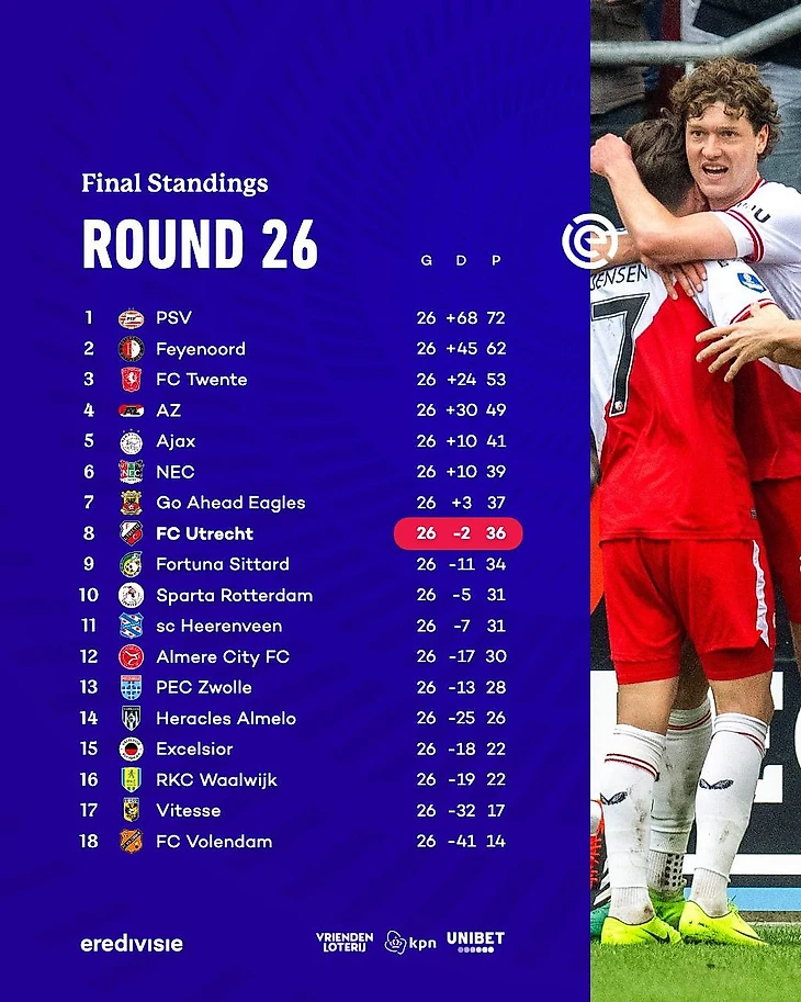 «Утрехт» остается на 8-м месте, а НЕК идет на 6-м