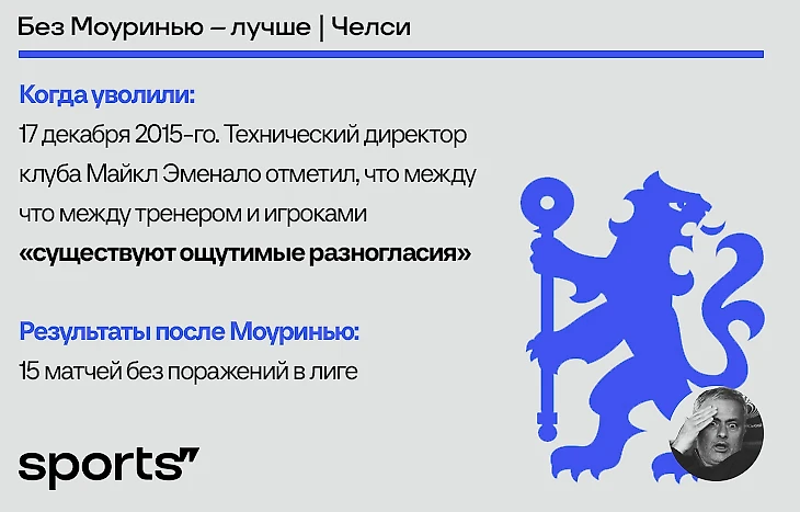 Уточнение: тут не будет первого ухода из «Челси» (сентябрь-2007), потому что обе стороны не признают увольнения – используют формулировка «по обоюдному согласию». Но и там после Моуринью команда выдала отличный сезон: второе место в АПЛ и финал ЛЧ.