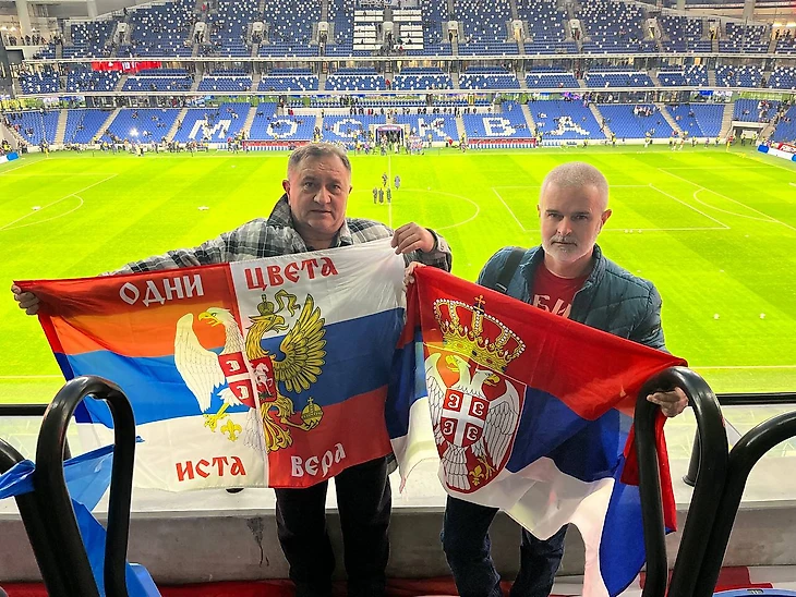 На одну из трибун зашли зрители в военной форме с флагами с буквой Z, возле другой ходил мужчина с георгиевским флагом и надписью «За Родину, за суверенитет, за Путина», за воротами сербов сразу повесили баннер дивизии Espanola и кричали про братство России и Сербии и «Косово – Сербия». Перед матчем еще и Григорий Лепс запел: