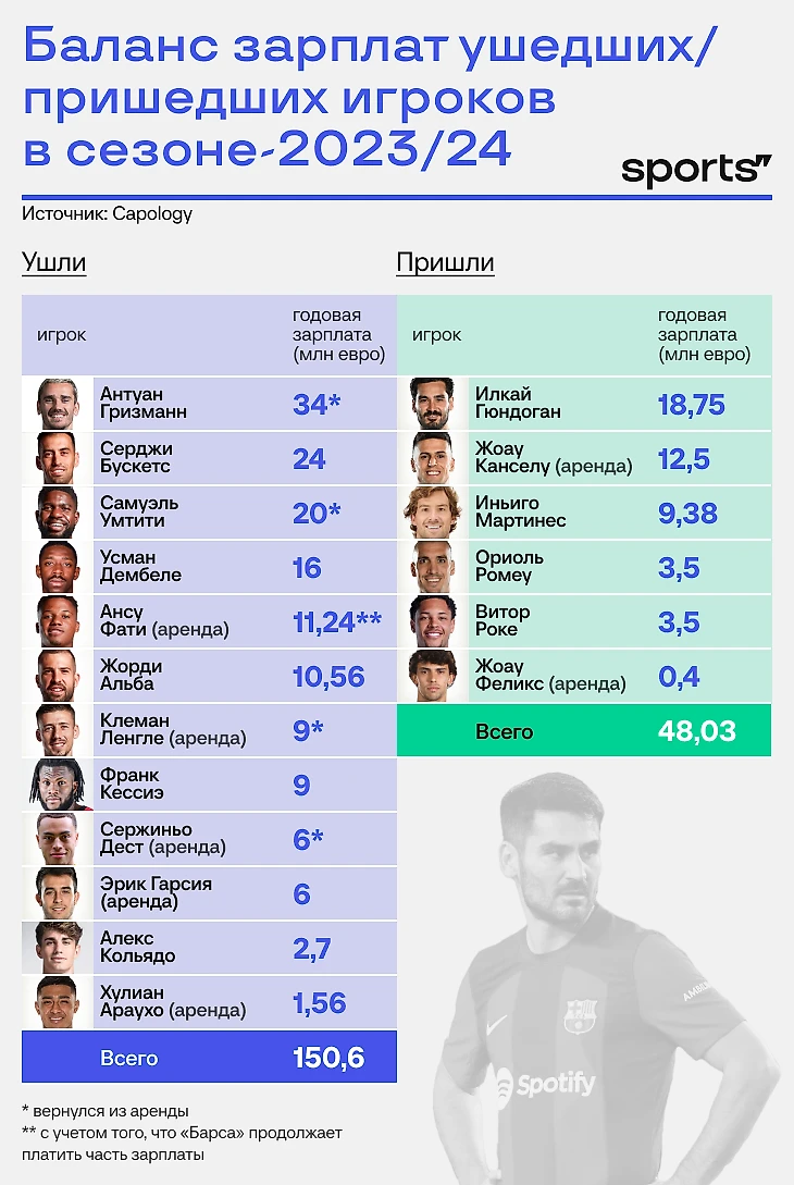 Неплохие цифры, хотя и при довольно упрощенном подсчете (например, не учитывалась амортизация или переподписание действующих контрактов). Так, продажа Антуана Гризманна в «Атлетико» кроме зарплаты сэкономила под потолком дополнительные 24 млн евро амортизации за последний год контракта (120 млн/5лет = 24 млн в год).