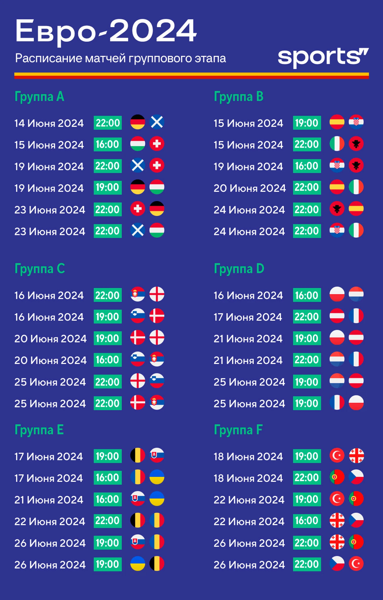 Чемпионат Европы пройдет в Германии с 14 июня по 14 июля. Матч открытия – Германия с Шотландией в Мюнхене.
