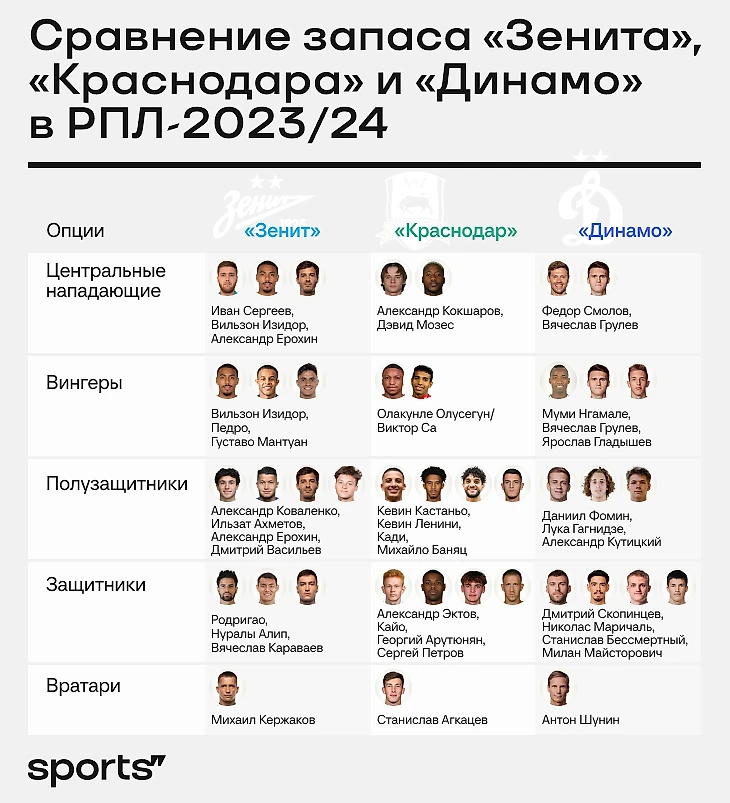 Уникальное преимущество «Зенита» – чемпионский опыт. Михаил Кержаков, Вильмар Барриос и Александр Ерохин застали пять чемпионств эпохи Семака, Вячеслав Караваев, Дуглас Сантос – четыре, Вендел и Андрей Мостовой – три, Клаудиньо, Нуралы Алип и Ивана Сергеева – два. Марио Фернандес трижды участвовал в драматичных чемпионских гонках РПЛ, Страхиня Эракович столько же раз выигрывал чемпионат Сербии.