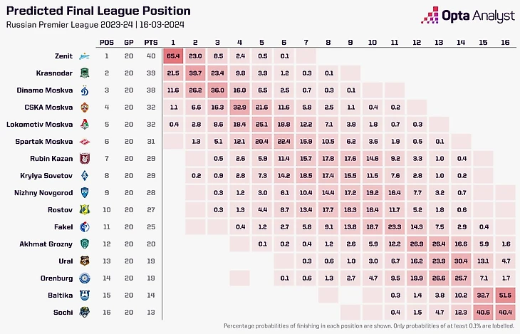 Модель прогнозов Opta (оценка вероятностей исходов каждого матча на основе коэффициентов Opta с учетом силы соперника) считает команду «Зенит» фаворитом: вероятность чемпионства – 65,4%, у «Краснодара» – 20,5, «Динамо» – 11,6%.