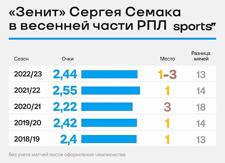 Еще один (да) аргумент в пользу «Зенита» – традиционно мощная весна при Семаке. Обычно «Зенит» сохранял преимущество, добытое осенью, только прошлой весной петербуржцы набрали меньше очков за игру (2,44), чем в осенней части (2,47).