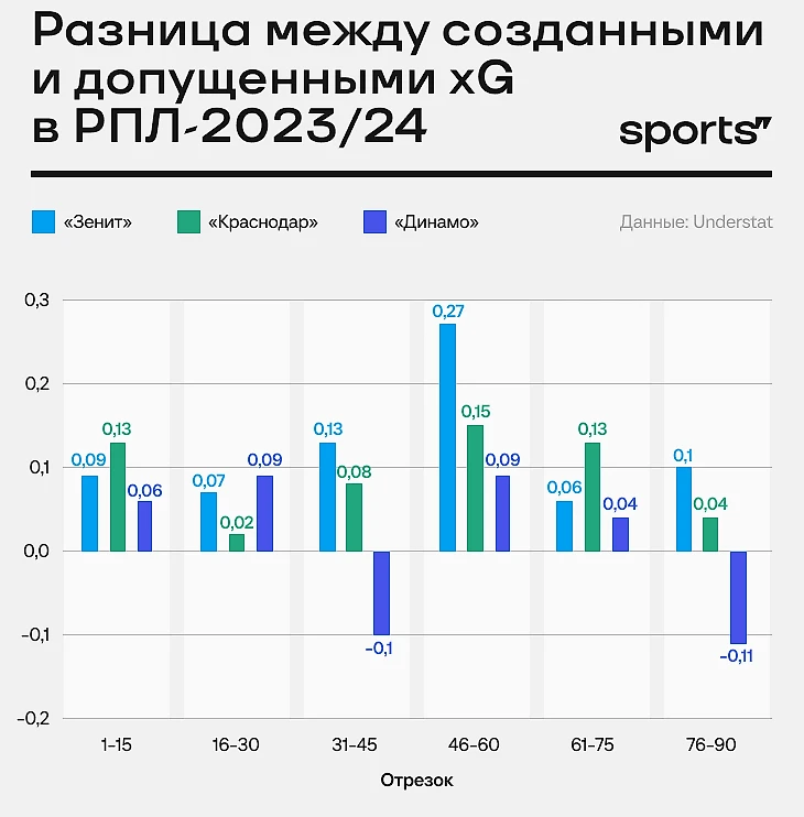 Также это худший оборонительный отрезок «Краснодара» (4 пропущенных гола, столько же пропустили в середине первых таймов, но после 75-й гораздо слабее по xG). Команда долго адаптировалась к откату Ивича в концовках. Плюс становилось тяжело без качественной подмены в опорной зоне: лидеры выдыхались, резервисты не тянули.