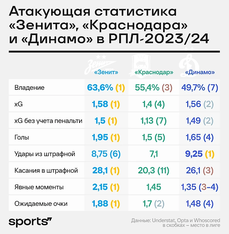 «Зенит» и «Краснодар» сбалансированнее «Динамо»: дают качество в обороне и умеют атаковать. «Динамо» при всей яркости на некоторых отрезках сезона даже уступало по созданным моментам.