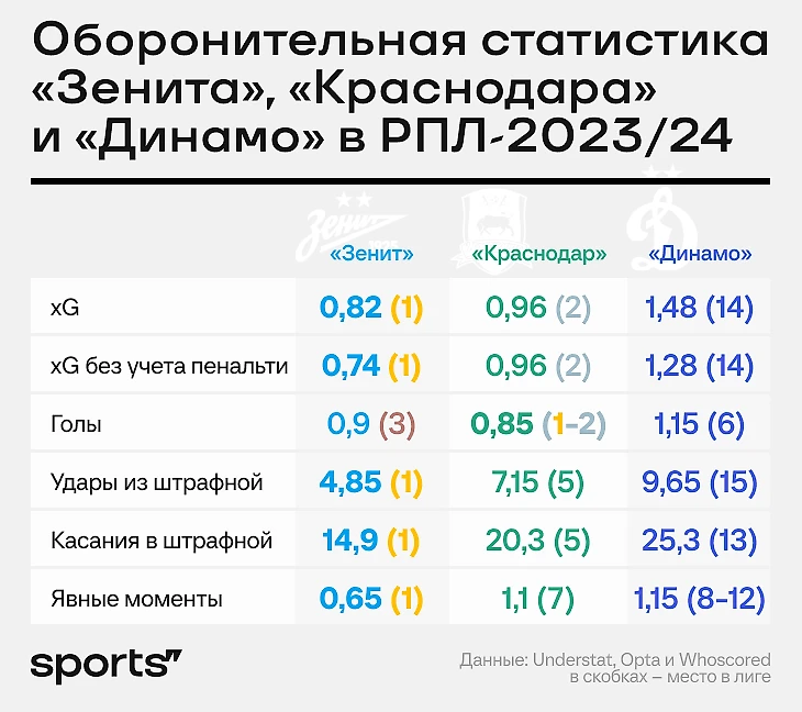 Несмотря на шестое место по пропущенным, команда Марцела Лички сильно уступает «Зениту» и «Краснодару» по остальным оборонительным показателям.