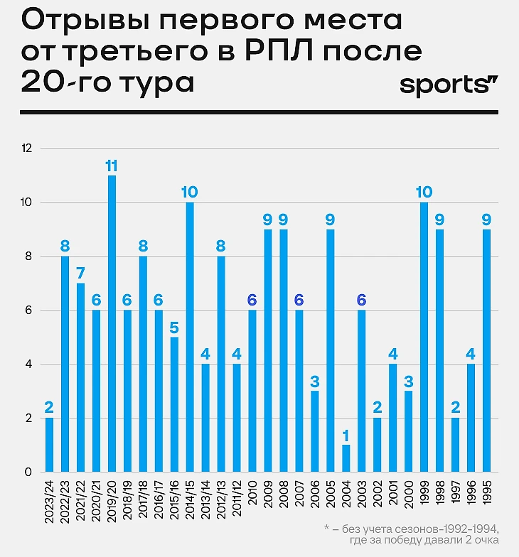 В последний раз настолько крутая чемпионская гонка случилась в уже упомянутом сезоне-2013/14, но она закрутилась ближе к финишу. После 20-го тура «Локомотив» Леонида Кучука вез четыре очка «Спартаку», который шел третьим, а ЦСКА вообще располагался на пятом, отставая от лидера на девять очков. В итоге ЦСКА одержал десять побед в десяти матчах и обогнал всех (64 очка), вторым стал «Зенит» (63), а «Локо» – только третьим (59).