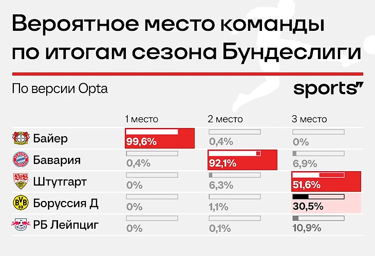 Перед началом сезона Opta давала «Байеру» лишь десятые доли процента – меньше единицы. Выше была не только «Бавария» (52,4%), но и «РБ Лейпциг» (33,3%) с «Боруссией» (12,2%).