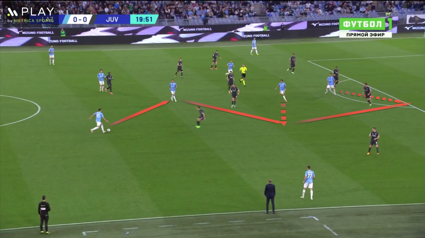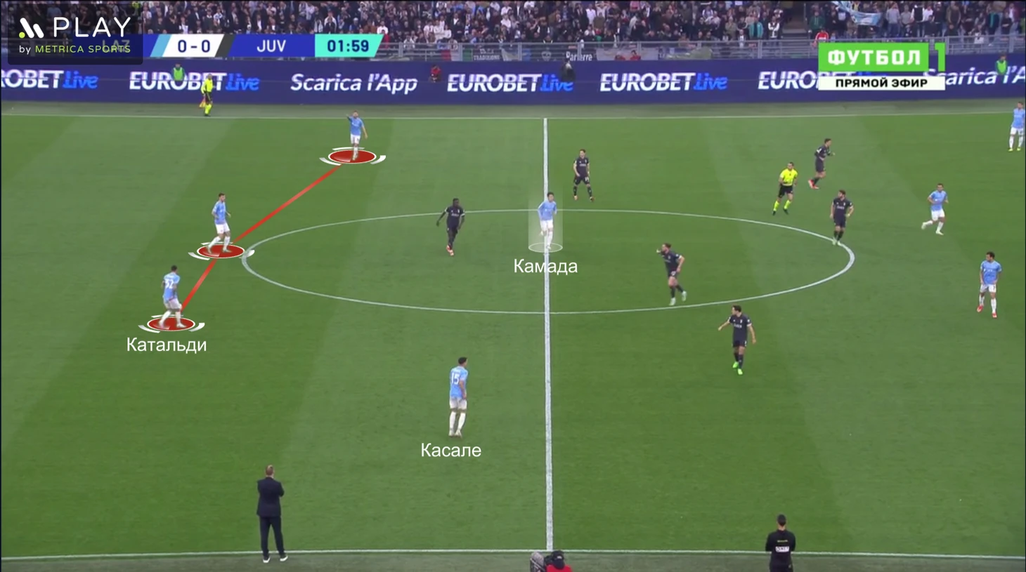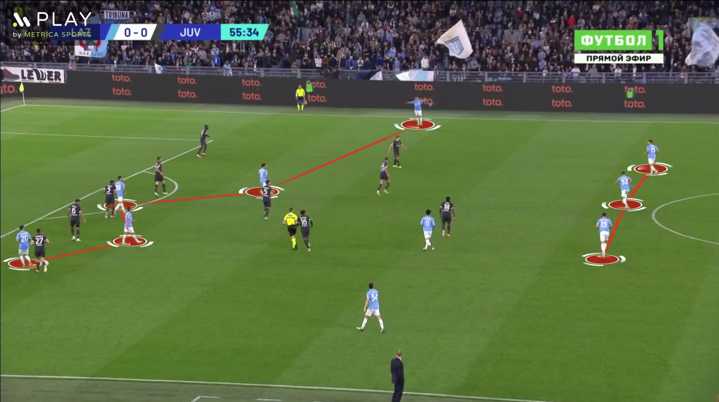 В позиционной атаке упор был сделан на вертикальную игру. Лучшая демонстрация того – 60 продвигающих и 69 передач в финальную треть. Это, наверное, в наилучшей степени отражает заряженность «Лацио» на вертикальности игры. По этой причине на чужой половине поля команда Тудора особо не задерживалась. Одно из первых затяжных расположений случилось только на 56-й минуте, откуда и можно сделать определенные выводы