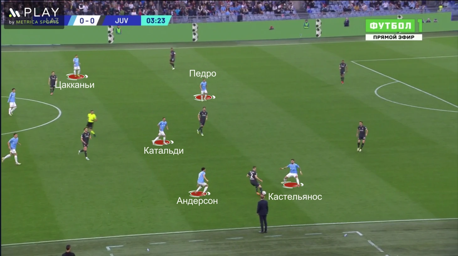 Изменения в структуре «орлов» стали заметны уже в самом начале встречи. При начале атак команда принимала структуру 3-2-5. Первая линия была крайне гибкой. Стабильно её заполнял лишь Романьоли, а ещё два игрока ситуативно менялись: Катальди, Гила и Касале, но сама структура была неизменной.