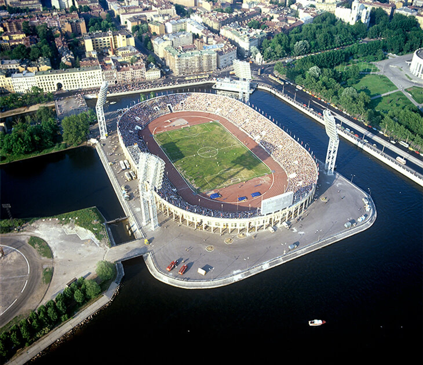 Стадион-остров, стадион-парк, стадион-холм – единственное из городских спортивных сооружений, неразрывно связанное с окружающей природой. Для его создания потребовалось возвести насыпь, высотой 16 м над уровнем моря. В качестве строительного материала использовали намывной грунт, что позволило сократить материальные издержки, очистить часть залива и укрепить берег острова. Явившийся из-под земли, он и как будто никуда не делся, а лишь взвалил себе на плечи новую конструкцию «Газпром Арены», появившейся уже в 2017 году.