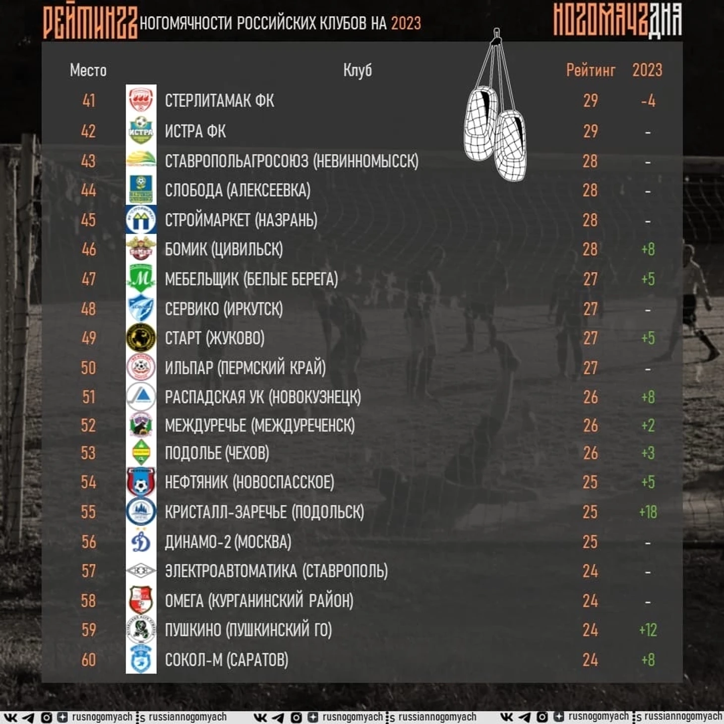 ФК Стерлитамак за счет поражений 2023 года выпадает из топ-40. Это первое снижение в топ-60. Остальные в этой двадцатке только набирали или замерли на месте.