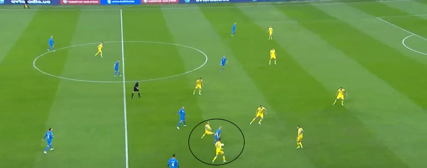 Периодически Украина включает прессинг и во время затяжной позиционной обороны, провоцируя соперника на риск. Как правило, эта тактика идет в ход, когда команда прижимается к периметру штрафной площади, что позволяет прессинговать с минимальным риском для появления свободных зон.
