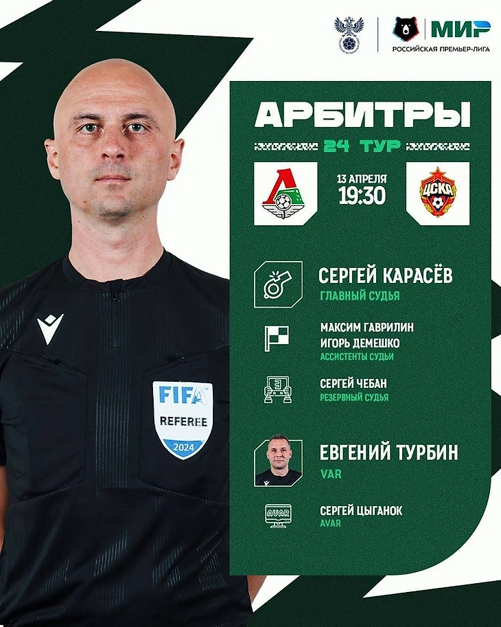 12 апреля 2024, 16:41 1 мин. Сергей Карасёв рассудит московское дерби «Локомотив» — ЦСКАААГАвтор525 подписатьсяЦСКАСергей Карасев