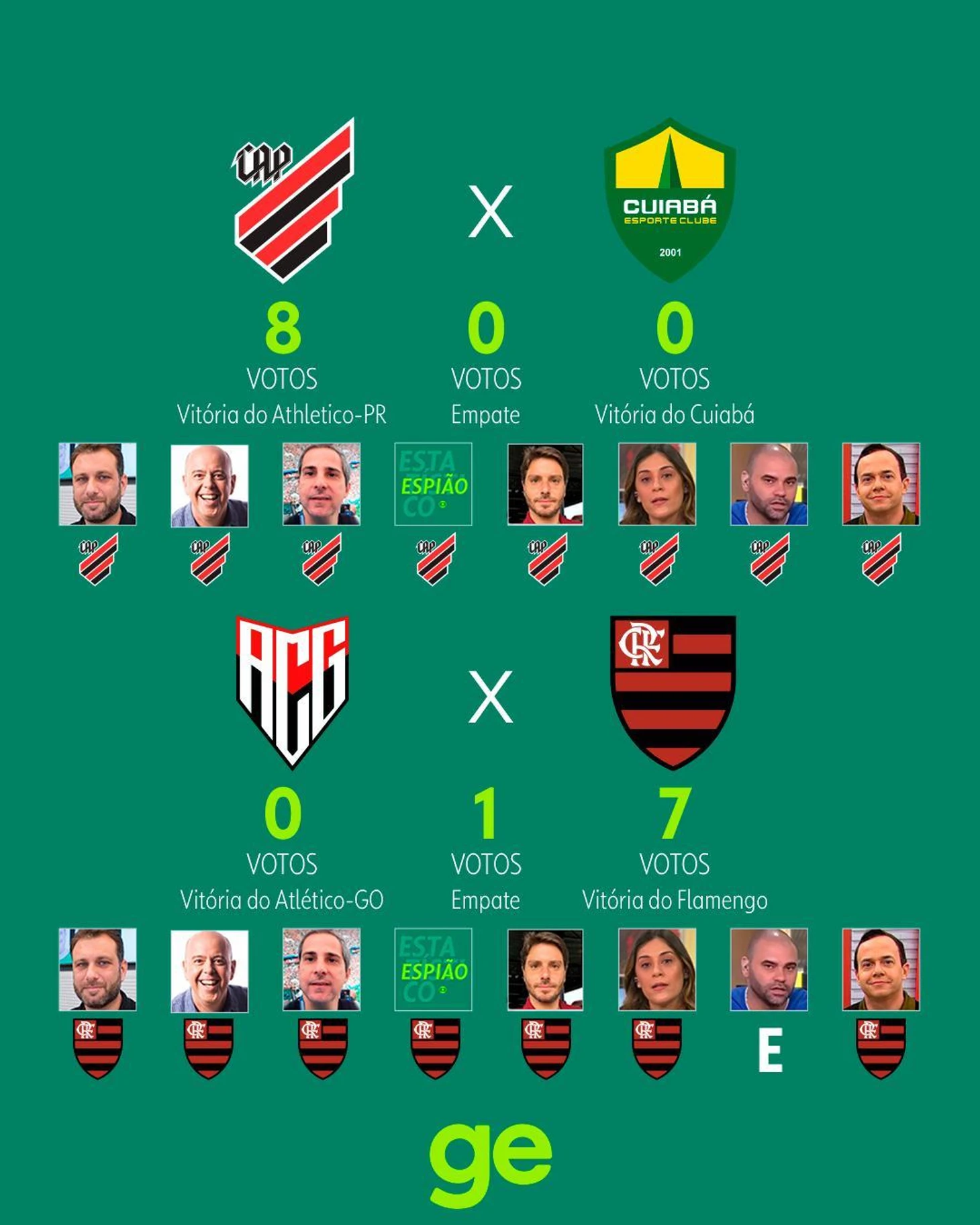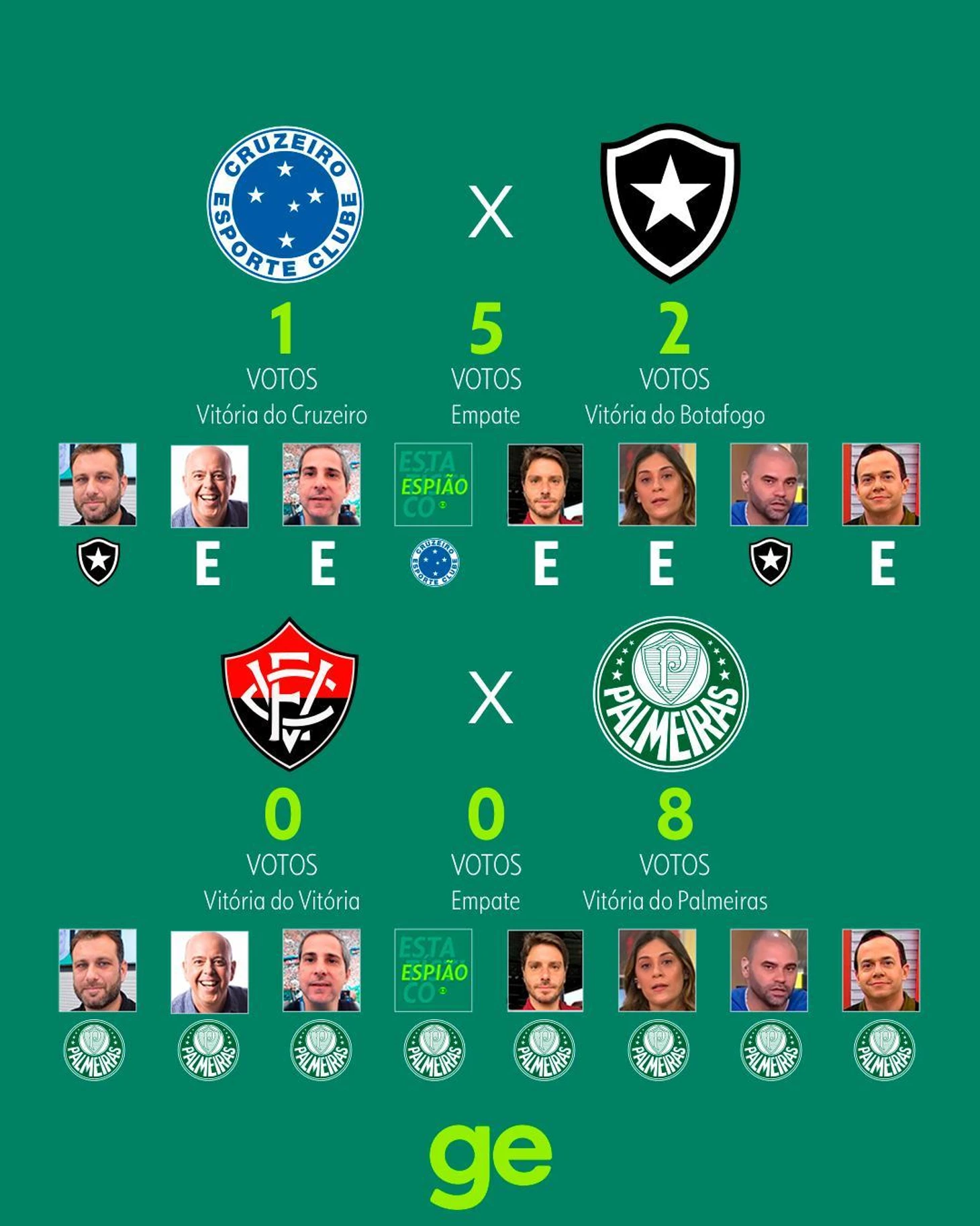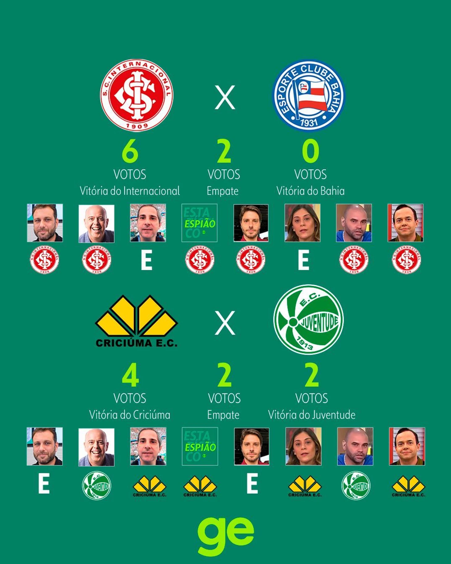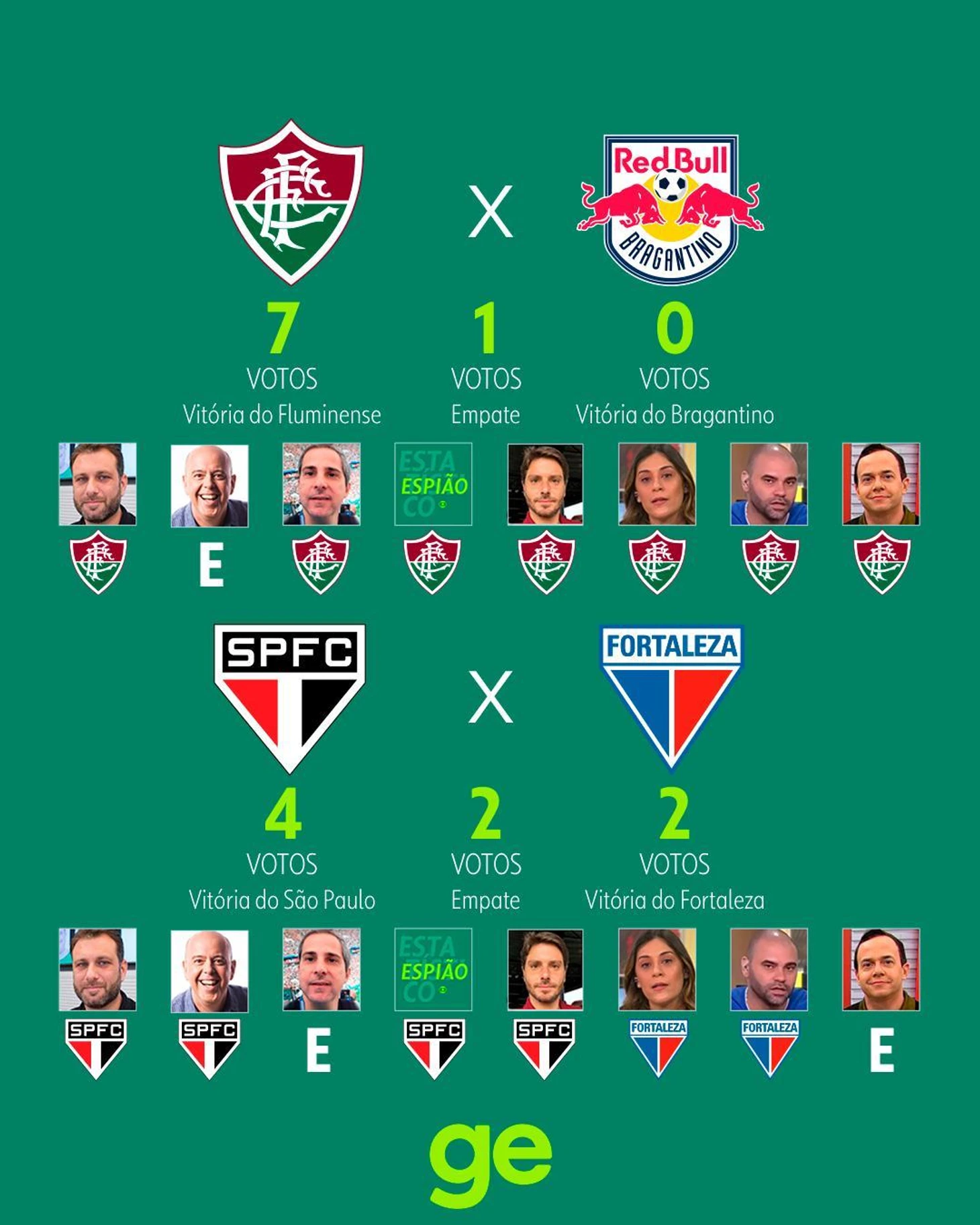 Globo же предпочел привести мнения своих колумнистов, отдавших голоса за тот или иной исход. Как видите, практически никто не верит в «Баию», «Брагантино», «Куябу» и «Гояниенсе» с «Виторией»