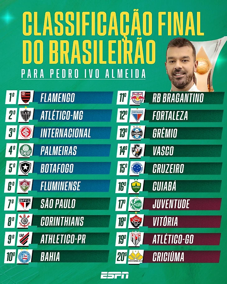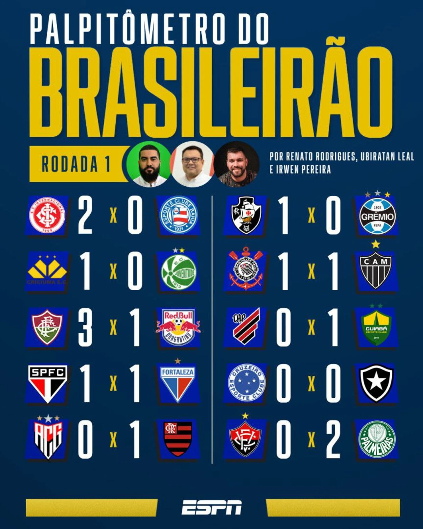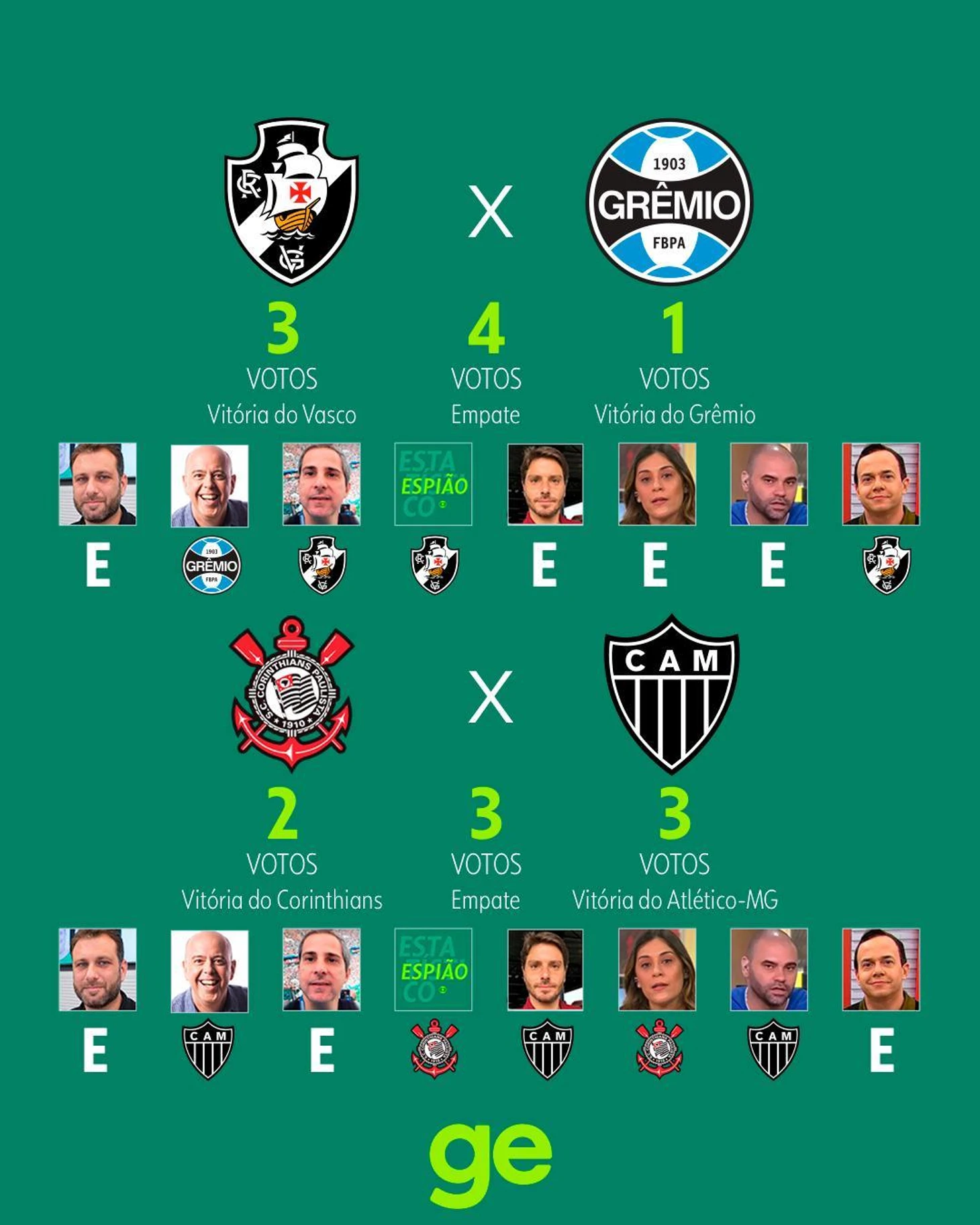 Globo же предпочел привести мнения своих колумнистов, отдавших голоса за тот или иной исход. Как видите, практически никто не верит в «Баию», «Брагантино», «Куябу» и «Гояниенсе» с «Виторией»