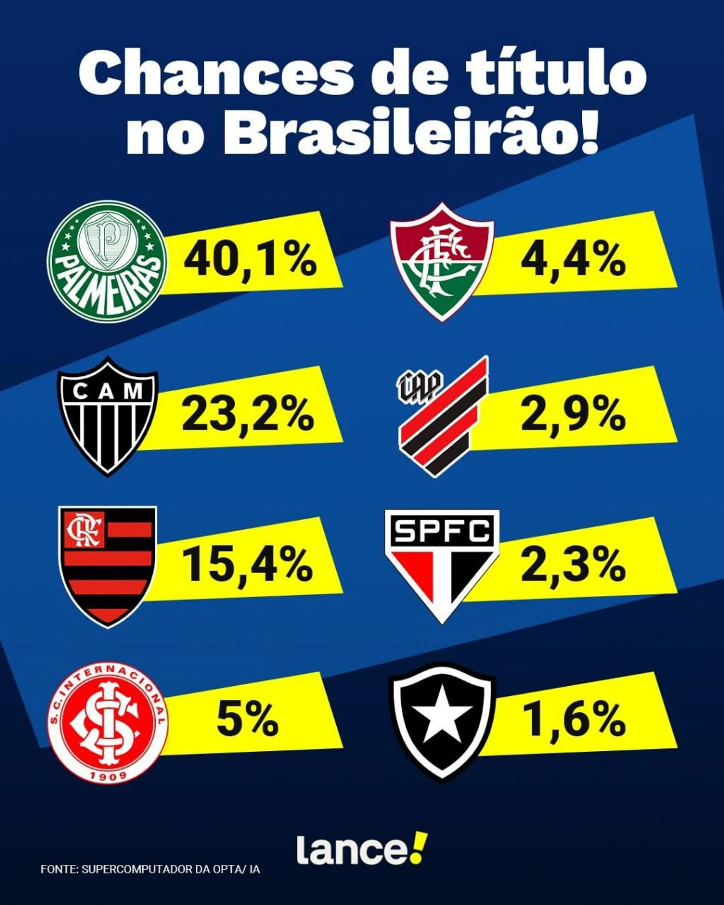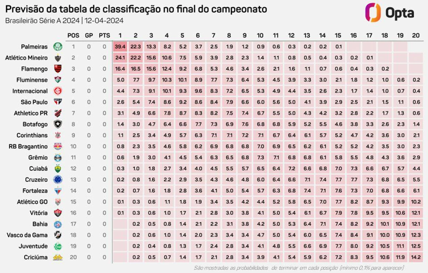 Суперкомпьютер Опта на основе математического моделирования (было просчитано 20 возможных сценариев развития событий) с вероятностью в 36% отдает пальму первенства Вердао. Вторые «Атлетико Минейро», потом «Фламенго».