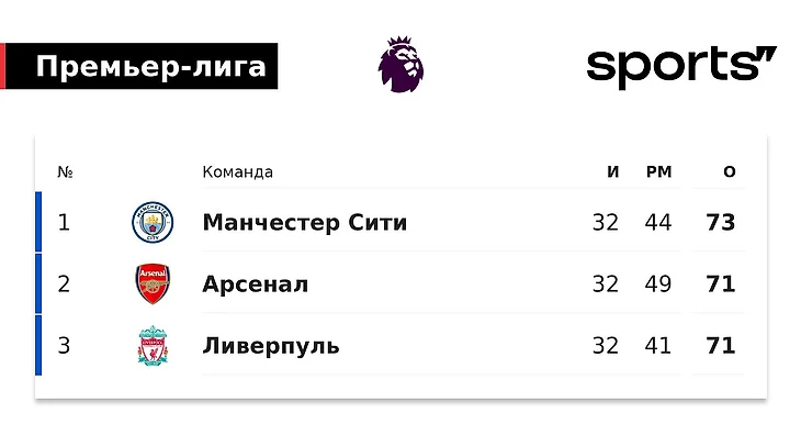 Так выглядит чемпионская гонка по итогам 32 туров. Напомним, первый критерий при равенстве очков – разница мячей.