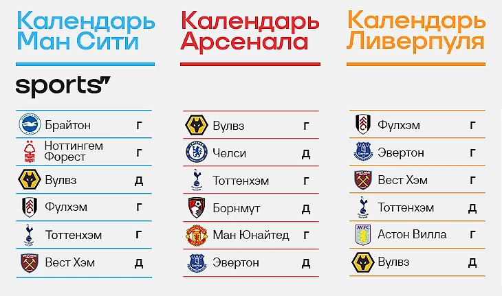 ● «Сити» и «Ливерпуль» сыграют по три матча дома, а «Арсенал» – четыре. У всех еще остался «Тоттенхэм», но в остальном кажется, что у «Сити» календарь чуть попроще.