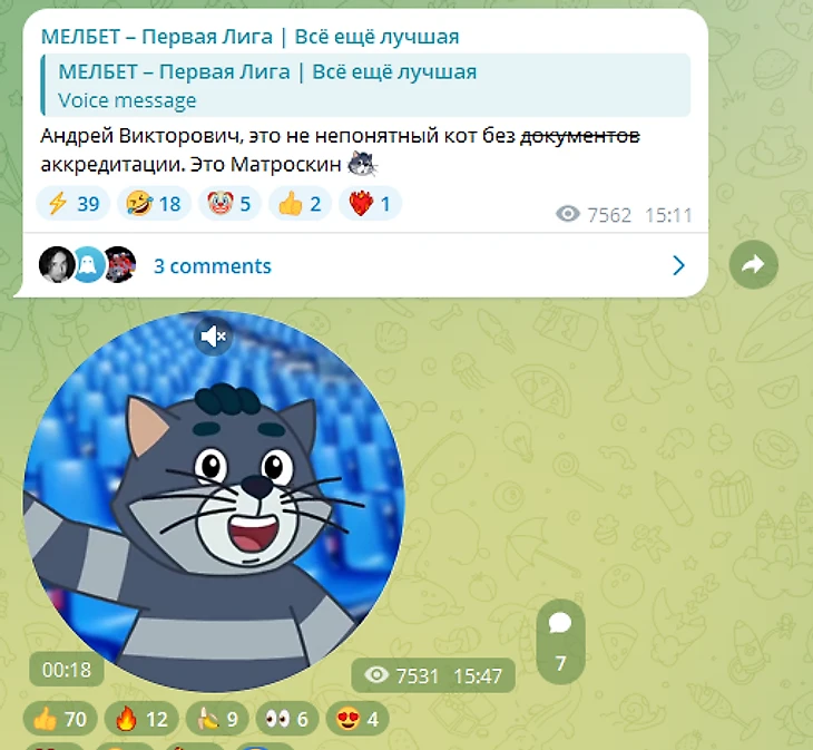 Кот Матроскин и пес Шарик не просто появились в социальных сетях ФНЛ. Они пошли дальше, прокомментировав матчи МЕЛБЕТ-Первой лиги. Матроскин был на матче «Химки» - «Шинник», а Шарик на «Сокол» - «Торпедо».