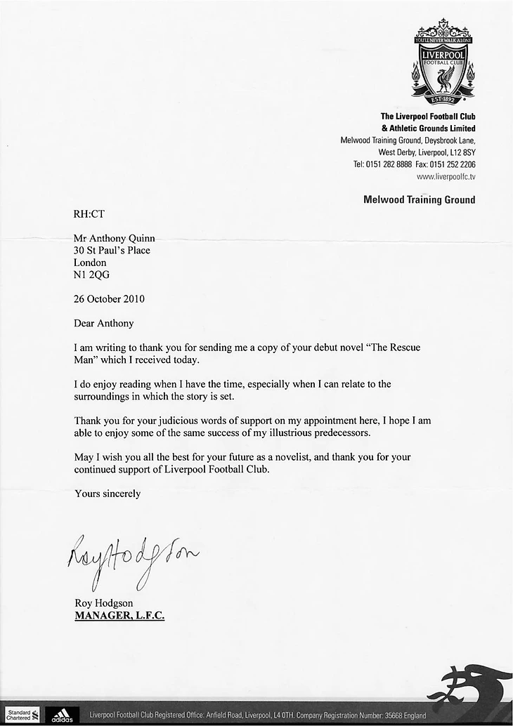 Когда в доме царила суматоха из-за режима Хикса-Джиллетта, приезд Роя Ходжсона на «Энфилд» был не самым удачным временем. Заслуженный игрок и Лучший менеджер года в сезоне 2009/10, он чаще занимался тем, что тушил пожары выбывания, чем руководил претендентами на титул. Болельщики с самого начала почувствовали эту неловкость. Он выглядел растерянным, когда результаты шли не в нашу пользу, и настаивал на том, что большие траты на трансферном рынке не являются решением проблемы. (Вместо этого он потратил немного, и очень неудачно). Мне было жаль его, и когда друг-писатель сказал мне, что недавно встретился с Ходжсоном и был впечатлен а) его доброжелательностью и б) его интересом к современной фантастике, я решил послать ему свой первый роман. Он назывался «Спасатель», и это название как нельзя лучше подходило к той работе, которую ему поручили на «Энфилде». Через два дня он написал ответное письмо, очень любезное, поблагодарил меня за книгу и выразил надежду, что он «добьется такого же успеха, как мои прославленные предшественники».