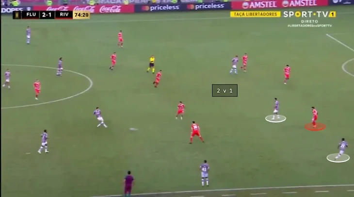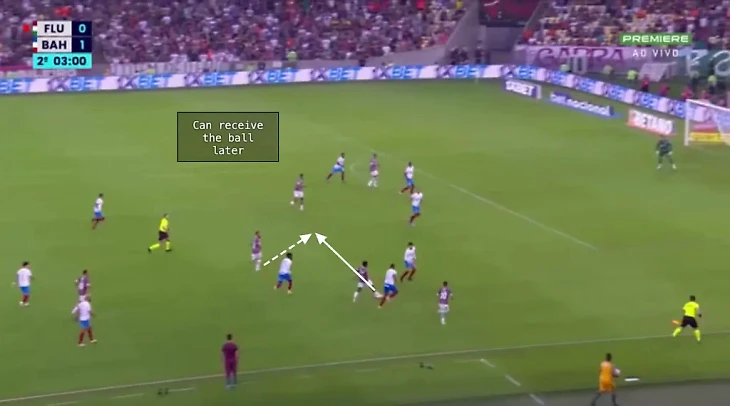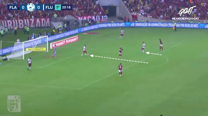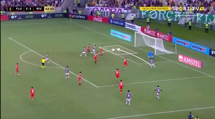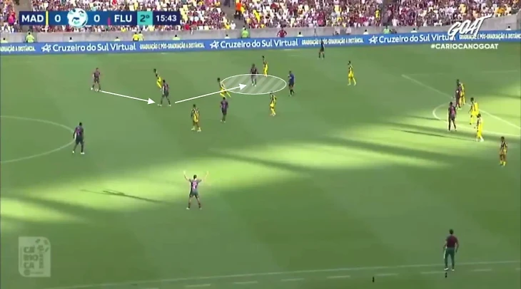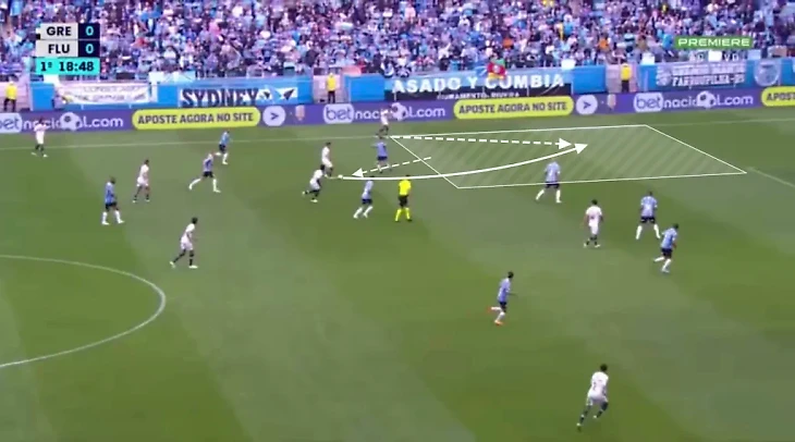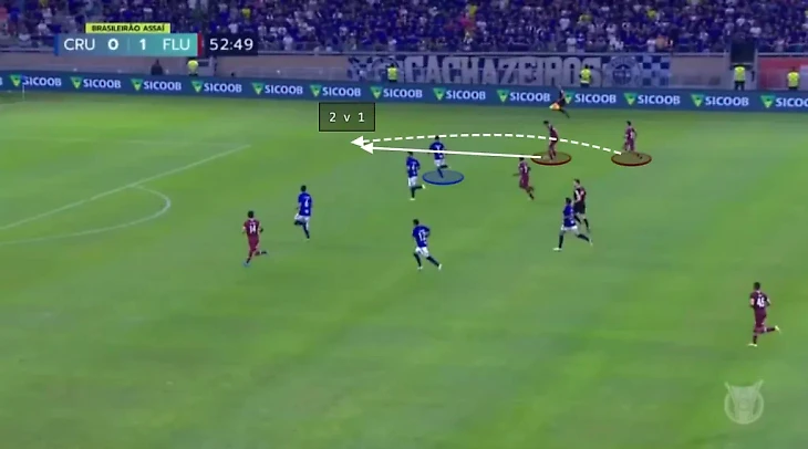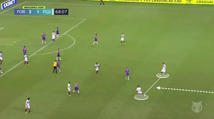 Следующим действенным инструментом в распоряжении «Флуминенсе» являются пасы в недодачу и отскоки игроков в пустую зону с целью вытянуть соперника на себя в прессинг и сломать линии, вскрывая таким образом защиту.
