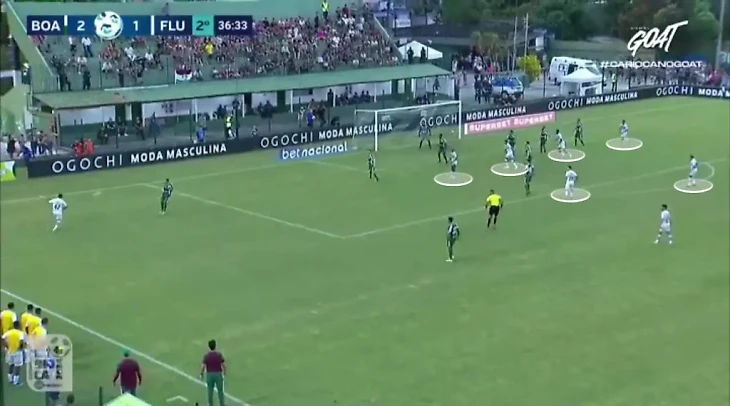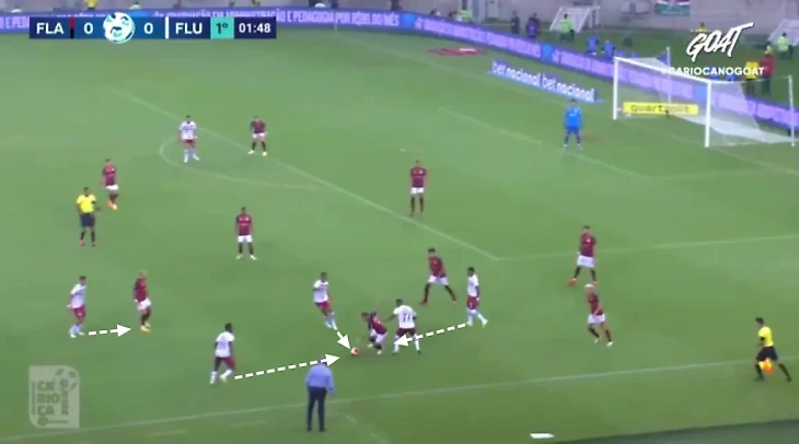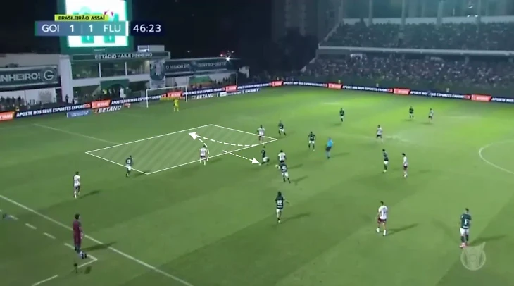 При коротких розыгрышах от ворот к голкиперу в штрафную площадь часто опускается один из опорных полузащитников. Получая передачу в низкой позиции, опорник провоцирует прессингующего его соперника оставить свою зону за пределами штрафной в попытке отобрать мяч. Это позволяет другому игроку «Флуминенсе» сместиться в образовавшееся пространство и открыться под передачу.