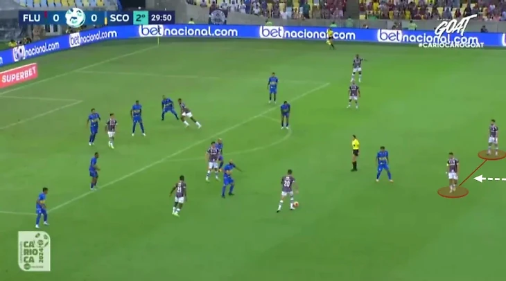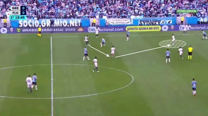 После получения передачи и прохода по флангу, игрок «Флуминенсе» с мячом либо смещается в центр для комбинирования с партнерами, либо делает навес в штрафную, которая всегда насыщается большим количеством игроков: