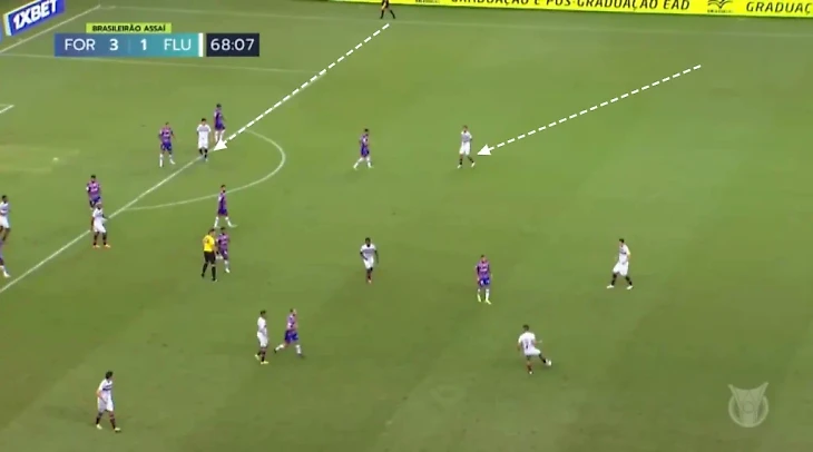 Kоманда Фернандо Диниза достаточно умело использует подобные ситуации. Игрок с мячом пасует на открытого партнера, после приема тот ждет, чтобы защитник выдернулся на него из линии. После того, как это происходит, за спиной у обороняющегося возникает свободная зона, в которую моментально следует передача на забегающего игрока «Флуминенсе».