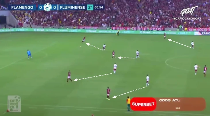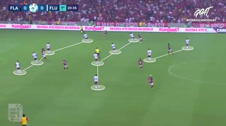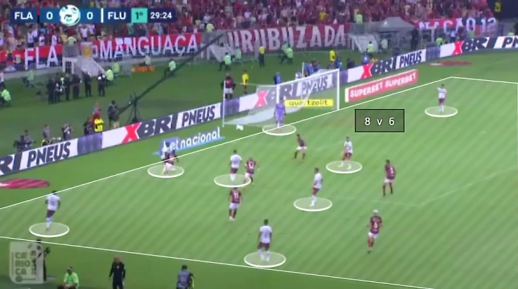 Принципиальным для тренера является создание численного преимущества на том участке поля, где в данный момент находится мяч. Kонечно, запрессинговать такую команду становится весьма непростой задачей, учитывая, что порой соотношение может достигать, например, 8-в-6 в пользу «Флуминенсе»: