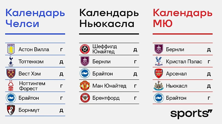Календарь «Челси» не назвать простым. Два следующих тура лондонцы проведут против команд, которые борются за ЛЧ: выезд к «Астон Вилле» и домашняя встреча с «Тоттенхэмом». Дальше попроще: потухший «Вест Хэм», непонятный «Ноттингем», подбитый травмами «Брайтон» и не особо мотивированный «Борнмут».